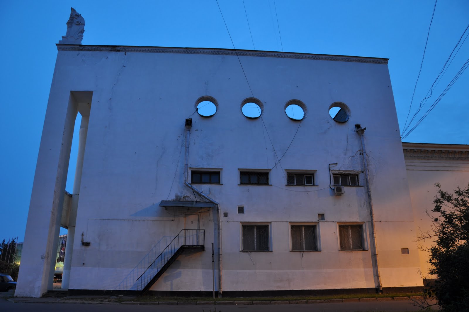 High modernist principles meet neo-classicism, all topped off with "ethnic" flourishes. Now the plaster crumbles and the insides are filled with boxed appliances waiting to be taken to showrooms, guarded by security men playing video games. In ten years' time I predict it will be filled with posh clubs as Moscow finally develops a taste for Soviet nostalgia...and is willing to hike in the two miles or so from the metro.